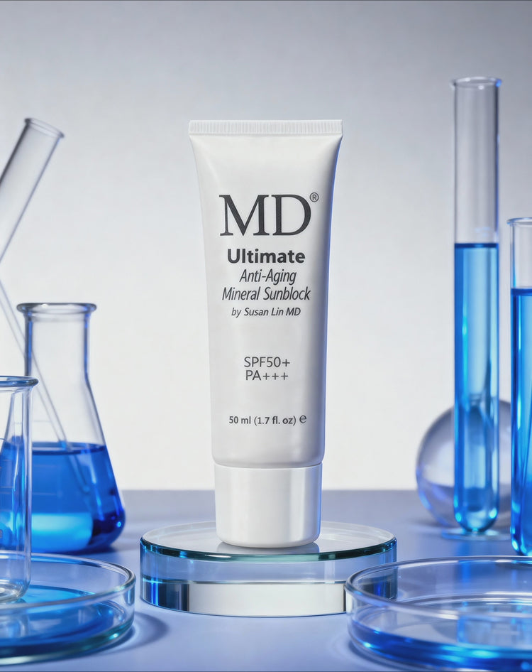 MD Ultimate Anti-Aging Mineral Sunblock SPF 50 in a sleek tube and box, perfect for protecting and rejuvenating skin.